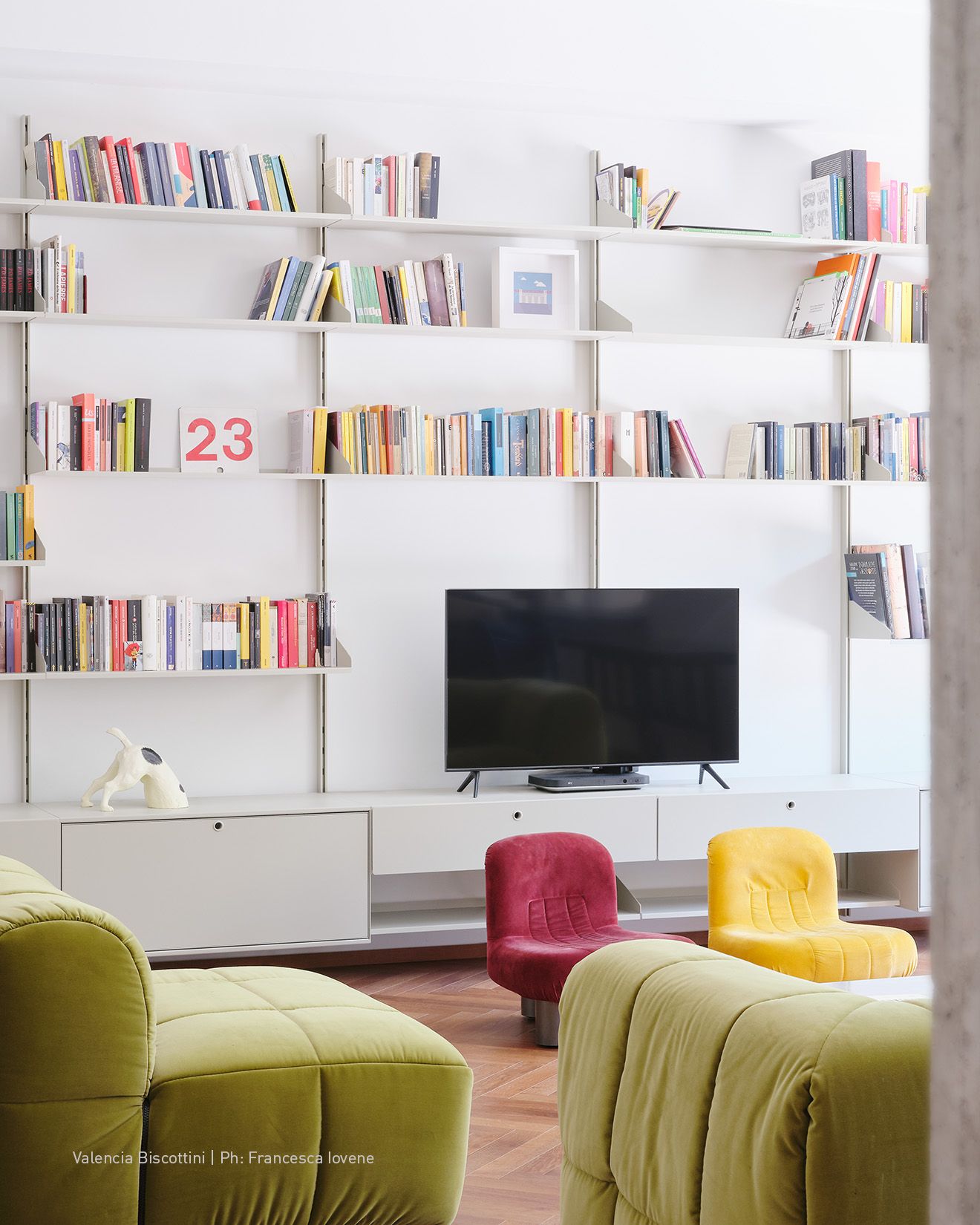 Shelving system and much more. K1+ is one of the most appreciated systems for its aesthetics and versatility. The aluminum rack uprights form the load-bearing structure that can be mounted on the wall or with feet, the latter being ideal for drywall. Modularity is the main feature: you can freely choose the position of all elements, such as shelves, desks and containers.